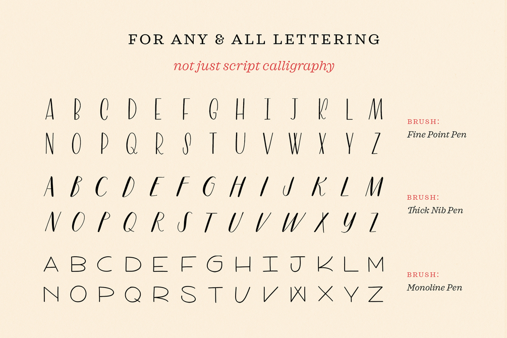 If you've been craving a Procreate brush that realistically emulates a pointed calligraphy pen, but makes flourishing and stroke contrast a breeze, then this set is for you. This brush pack contains the 7 calligraphic brushes I've perfected over the years for my own work. I personally use them every day.